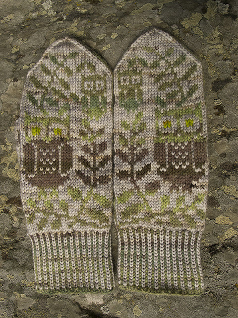 Toiseksi langaksi valitsin Pirkanmaan Kotityön Kirjo-Pirkan, raitalangassa oli ehkä vähän liian läheisiä sävyjä tuon ei niin tasavärisen harmaan kanssa mutta tykkään itse lopputuloksesta, eihän ne oikeatkaan pöllöt aina niin selkeästi erotu ympäristöstään.